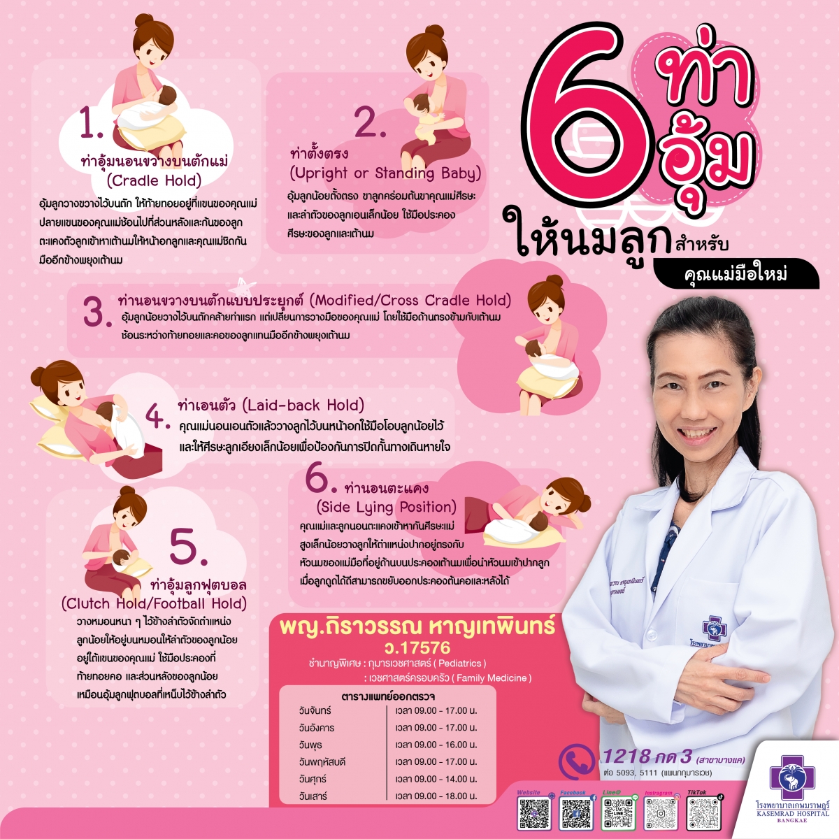 6. ท่านอนตะแคง (Side Lying Position) คุณแม่และลูกนอนตะแคงเข้าหากันศีรษะแม่สูงเล็กน้อยวางลูกให้ตำแหน่งปากอยู่ตรงกับหัวนมของแม่มือที่อยู่ด้านบนประคองเท้านมเพื่อนำหัวนมเข้าปากลูกเมื่อลูกถูกได้ถีสามารถขยับออกประคองต้นคอและหลังได้