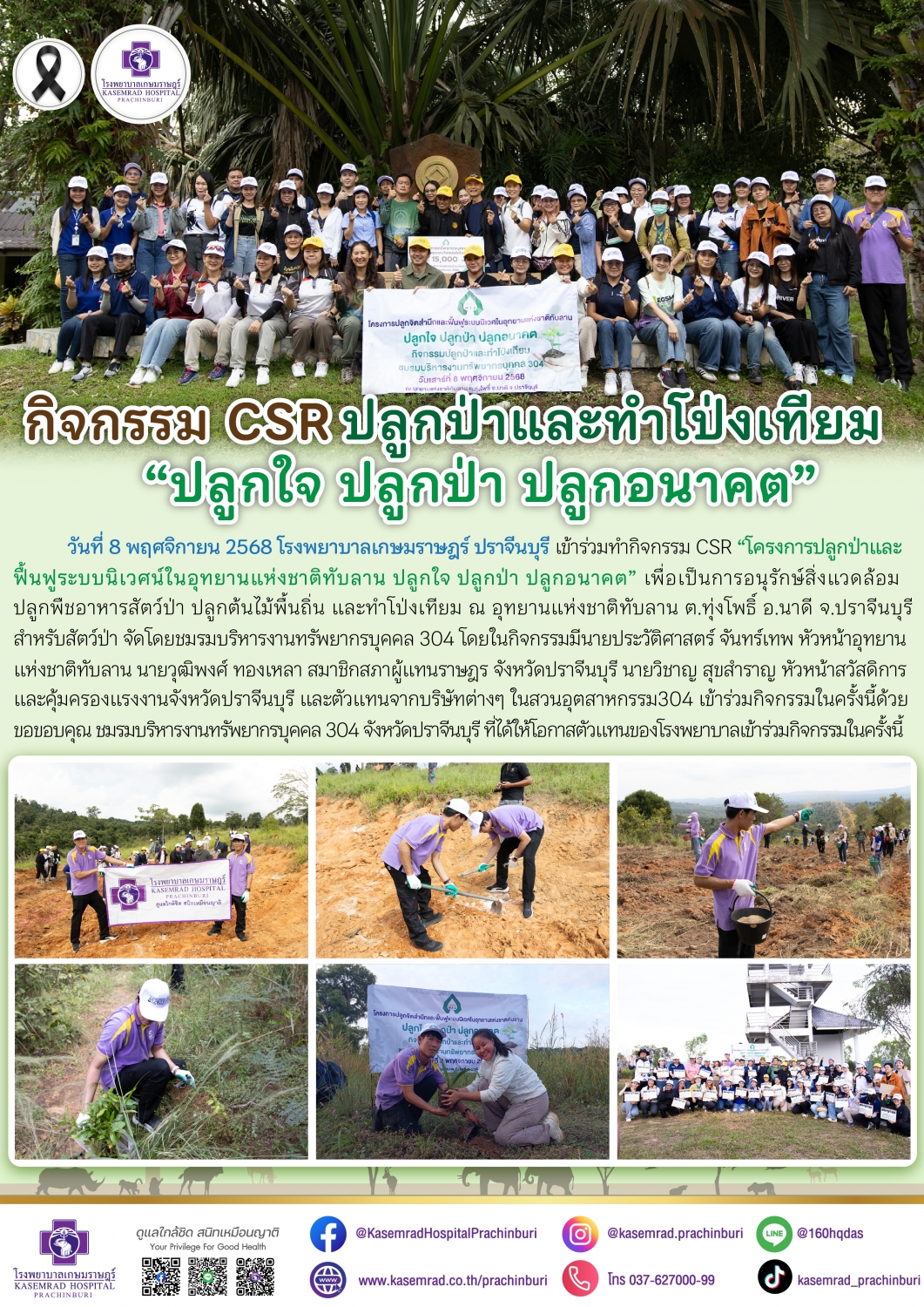 โรงพยาบาลเกษมราษฎร์ ปราจีนบุรี เข้าร่วมทำกิจกรรม CSR “โครงการปลูกป่าและ ฟื้นฟูระบบนิเวศน์ในอุทยานแห่งชาติทับลาน ปลูกใจ ปลูกป่า ปลูกอนาคต”