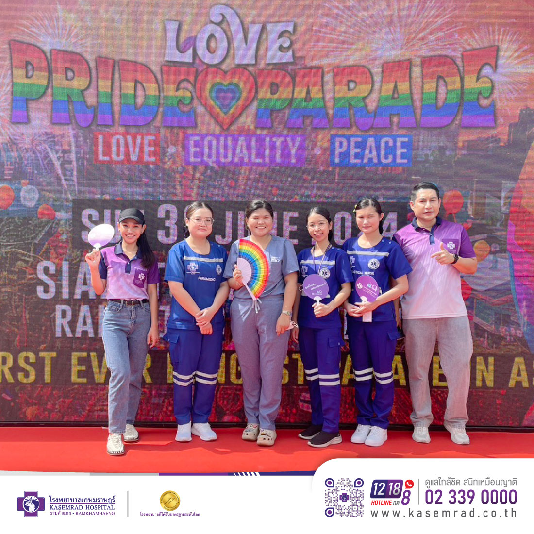 โรงพยาบาลเกษมราษฎร์ รามคำแหง ให้การสนับสนุนรถพยาบาลฉุกเฉิน (Ambulance) พร้อมนักเวชกิจฉุกเฉินและเจ้าหน้าที่ปฐมพยาบาล เพื่อให้บริการดูแลปฐมพยาบาลเบื้องต้น ในงาน “LOVE PRIDE PARADE 2024” พาเหรดฉลองส่งท้ายเดือนแห่งสีรุ้งสุดยิ่งใหญ่ ซึ่งจัดโดยรัฐบาลและหน่วยงานที่เกี่ยวข้องร่วมกับภาคีเครือข่ายภาคเอกชนชั้นนำมากกว่า 100 องค์กร ณ สนามกีฬาแห่งชาติศุภชลาศัย เมื่อวันที่ 30 มิถุนายน 2567 ที่ผ่านมา