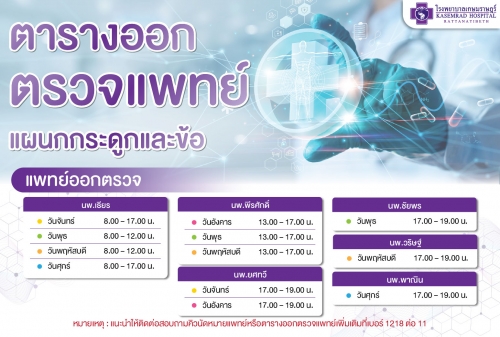 | หมายเหตุ : แนะนำให้ติดต่อสอบถามคิวนัดหมายแพทย์หรือตารางออกตรวจแพทย์เพิ่มเติมที่เบอร์ 1218 ต่อ 11 |