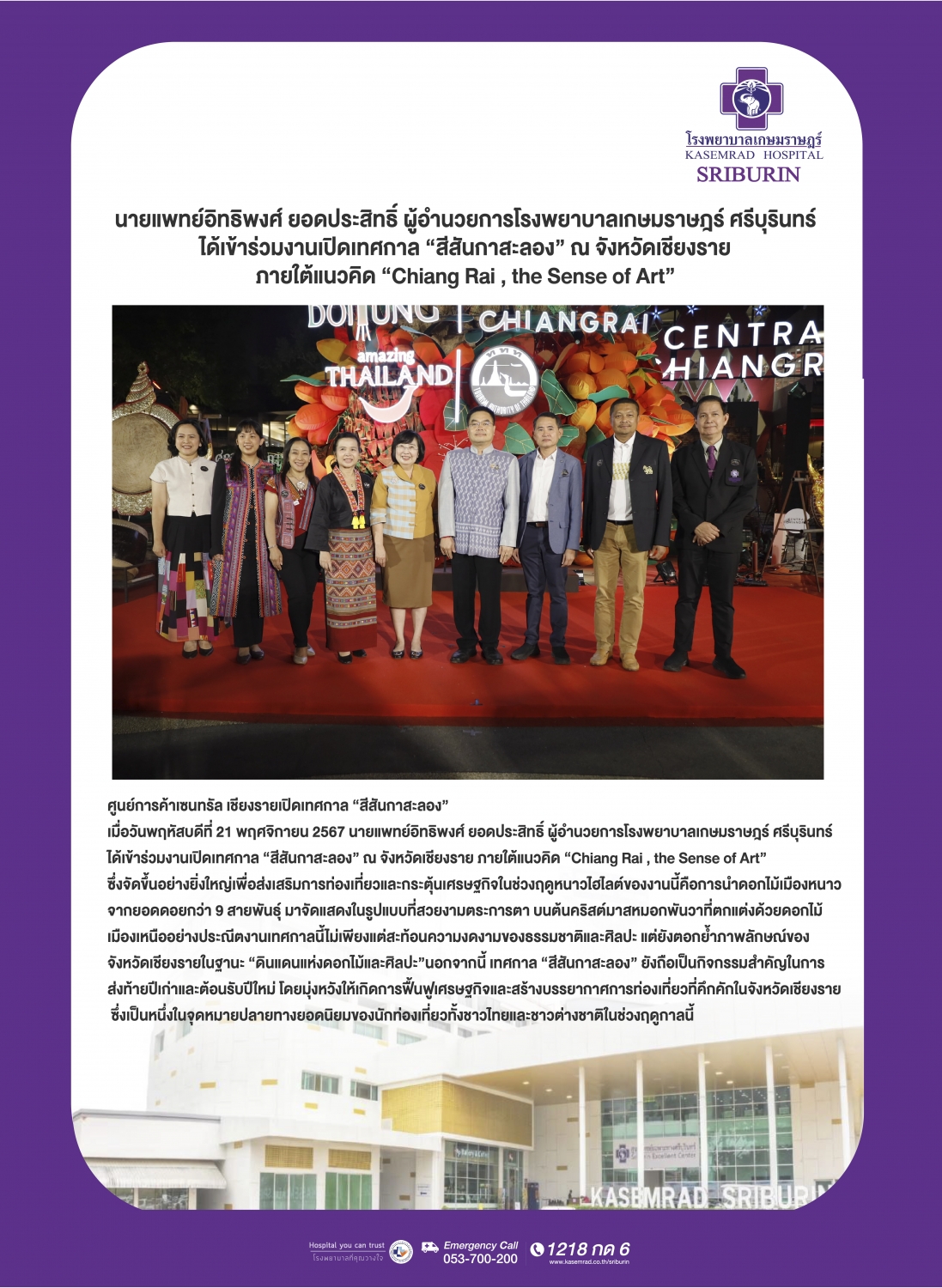 นายแพทย์อิทธิพงศ์ ยอดประสิทธิ์ ผู้อำนวยการโรงพยาบาลเกษมราษฎร์ ศรีบุรินทร์ได้เข้าร่วมงานเปิดเทศกาล “สีสันกาสะลอง” ณ จังหวัดเชียงราย ภายใต้แนวคิด “Chiang Rai , the Sense of Art”