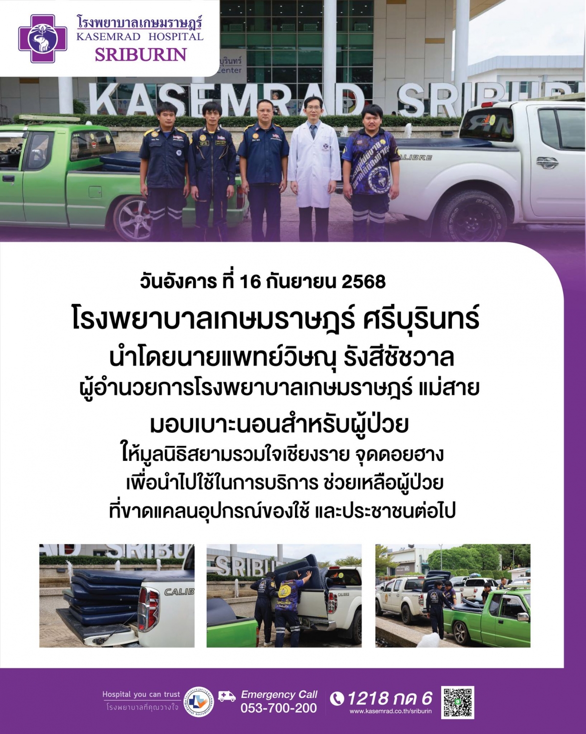 โรงพยาบาลเกษมราษฎร์ ศรีบุรินทร์ นำโดยนายแพทย์วิษณุ รังสีชัชวาล ผู้อำนวยการโรงพยาบาลเกษมราษฎร์ แม่สาย มอบเบาะนอนสำหรับผู้ป่วย ให้มูลนิธิสยามรวมใจเชียงราย จุดดอยฮาง เพื่อนำไปใช้ในการบริการ ช่วยเหลือผู้ป่วยที่ขาดแคลนอุปกรณ์ของใช้ และประชาชนต่อไป